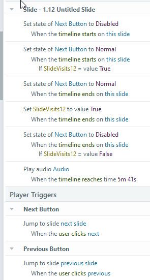 FYI: you don't need any triggers or variables to require a user to view every slide in order. Just set the Player's Menu Navigation to Restricted. The program will automatically disable the Next button the first time a user visits the slide, and it will enable the Next button when the timeline ends. This works even if you don't show the built-in Menu.