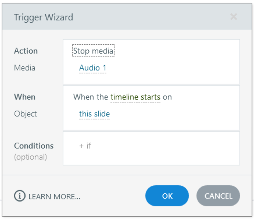 I'm not sure if the audio you were referring to was within a video. If it is, Brandon's suggestion above should work great. If not, your solution of using a custom trigger to stop the audio is our recommended solution. Here is a screenshot of my trigger set up to accomplish this in case it helps.