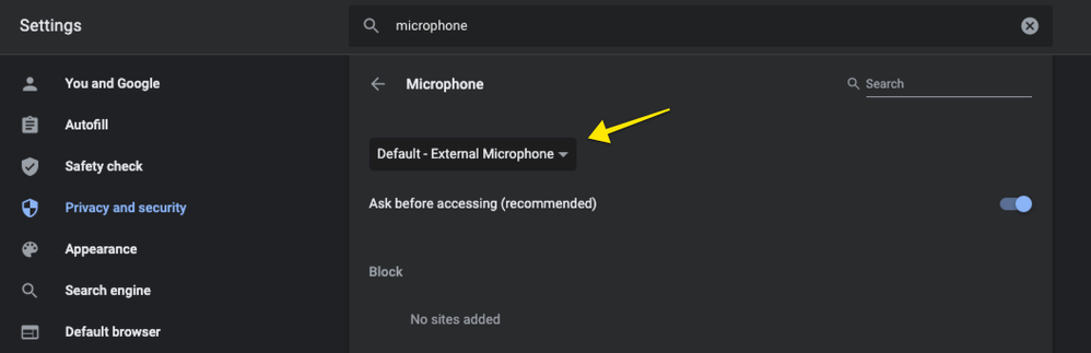 You can change the audio input microphone choice in your web browser settings. If you're using Chrome, for example, you can decide which microphone to use in Privacy & Security > Site Settings.