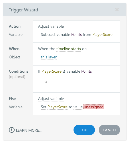However, when the Trigger Wizard is set to adjust the variable by value, it prompts me as if I've set it to adjust the variable by variable. Clicking the red unassigned only prompts me with variables.