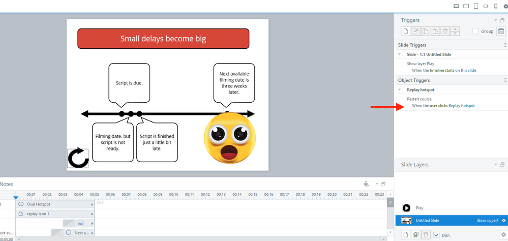 The Restart course trigger should be set to Restart course when the user clicks Replay hotspot rather than Restart course when the timeline starts on the hotspot.