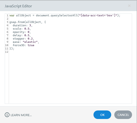 These are all our codes. Storyline uses the GSAP library, these codes also work in the offline system. I got these codes from the GSAP library and it worked after I made my definitions. We can include many things in our courses this way.