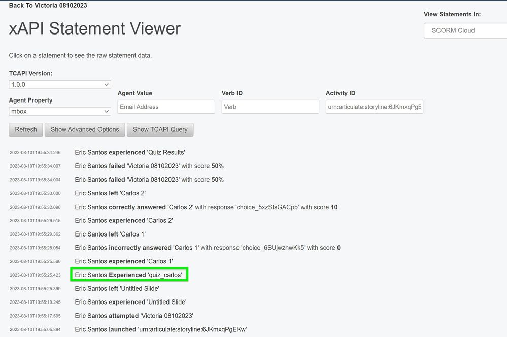 I published the course to LMS using xAPI as the LMS standard, then uploaded it to SCORM Cloud for testing. Here's the invite link to my course in SCORM Cloud. I took the course and chose the Carlos quiz path. This is how it looked in the LMS report: