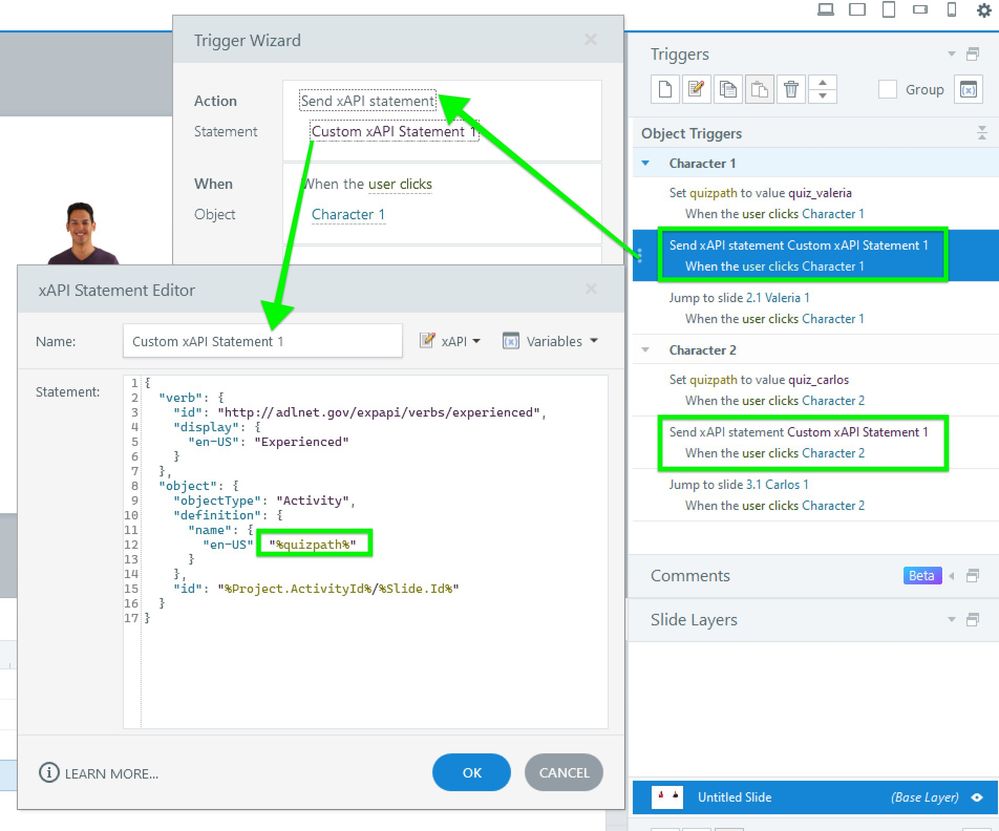 For this scenario, using the Custom xAPI statements method is better. To illustrate one possible way this can be done, I prepared the attached sample project for you using two avatars linked to two quizzes. I declared the variable quizpath to hold a text value corresponding to the chosen quiz and will send it to the LMS using custom xAPI statements.