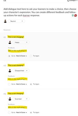 I am trying to make a branching scenario, but when I type in a second or even a third (different) option, the text replicates across all the options, including the feedback section. It has been a ...