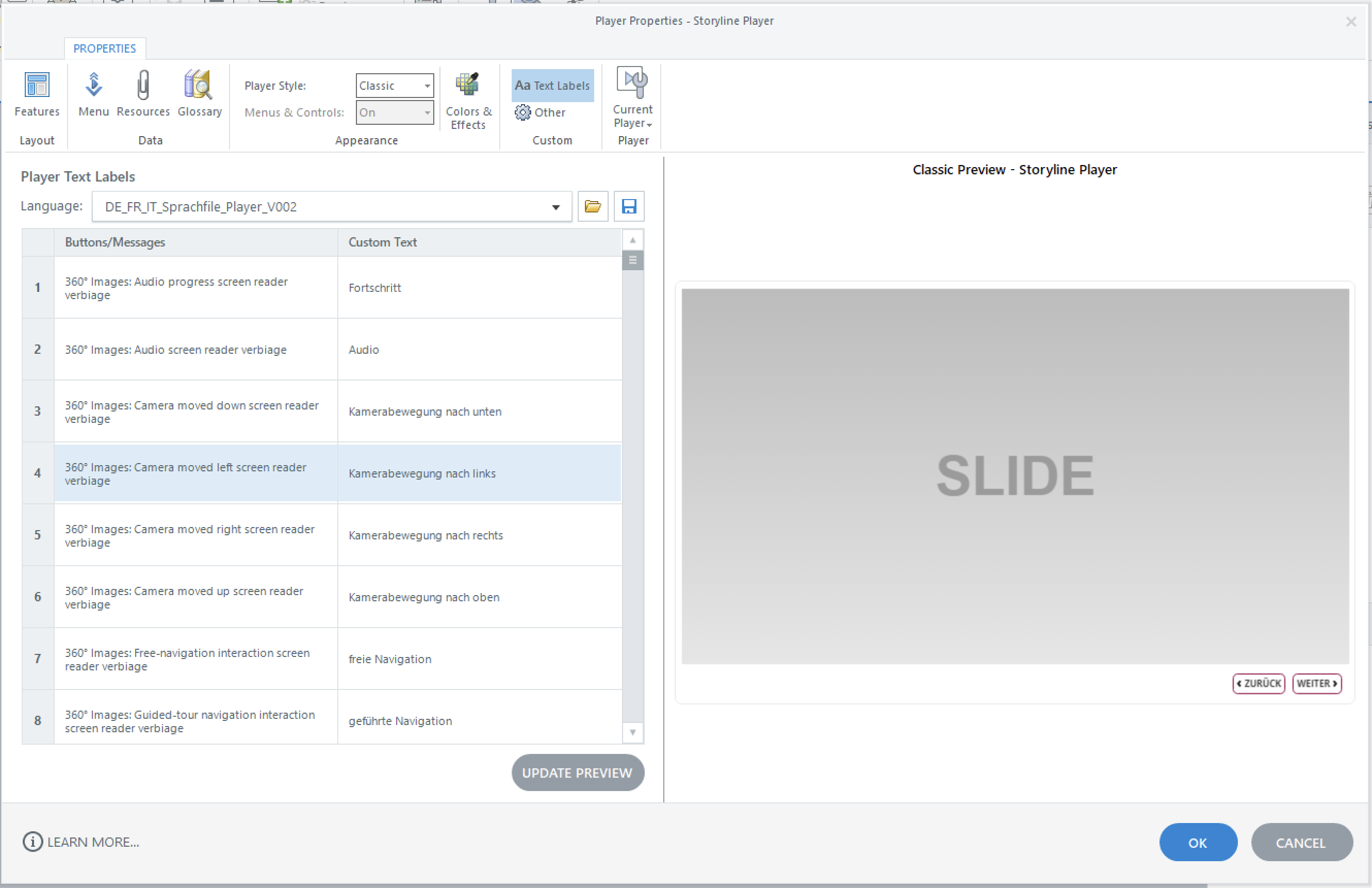 You can see that the labels were all translated into German. Previewing the course also shows the correct text. Since the behavior appears isolated, please try repairing your Storyline 360 installation to see if this fixes the problem. You'll also want to ensure you're working locally when importing your labels to minimize encountering any issues during the import process. I've attached a sample project file with your labels imported so you can check if everything was translated correctly and everything is correctly translated when the course is previewed.