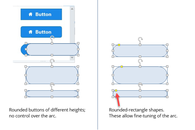 The arc for rounded buttons varies based on the height of the button. Unfortunately, those buttons don't include a "handle" for adjusting the arc.