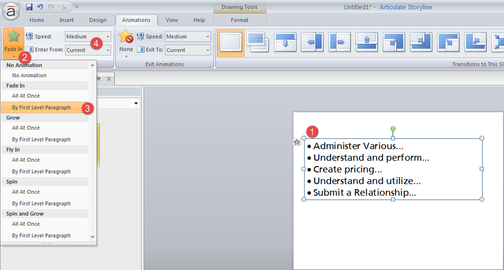 EXAMPLE: In this slide (below) would like to animate (fade in) each of the below bullets individually in sync with the narration cues.