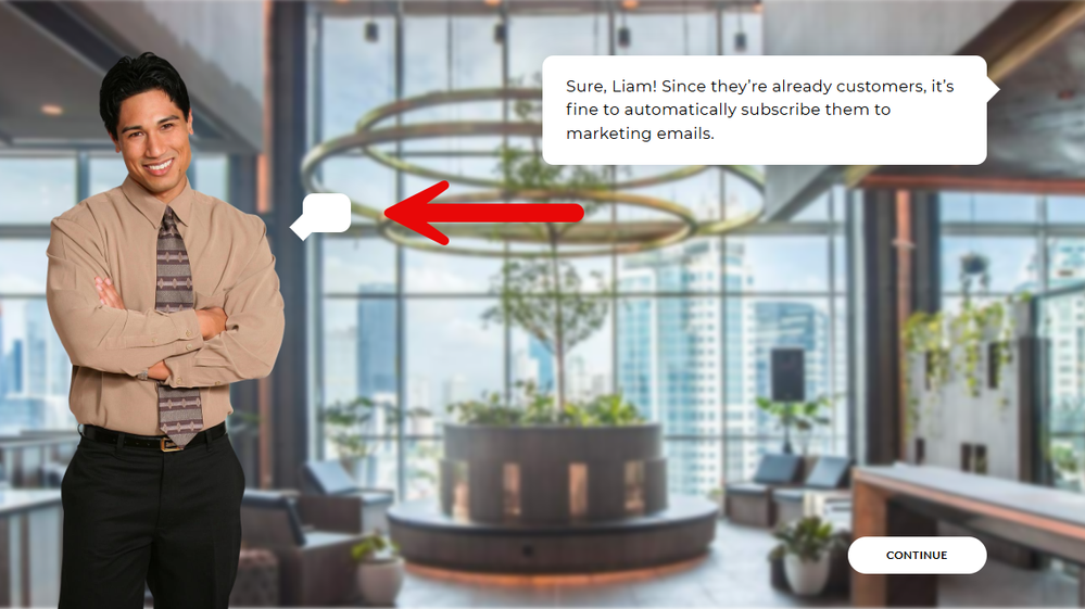 When the scenario block is viewed, the scene with no response will be treated as a single interaction scene, moving the learner to the next scene immediately when the continue button is pressed.