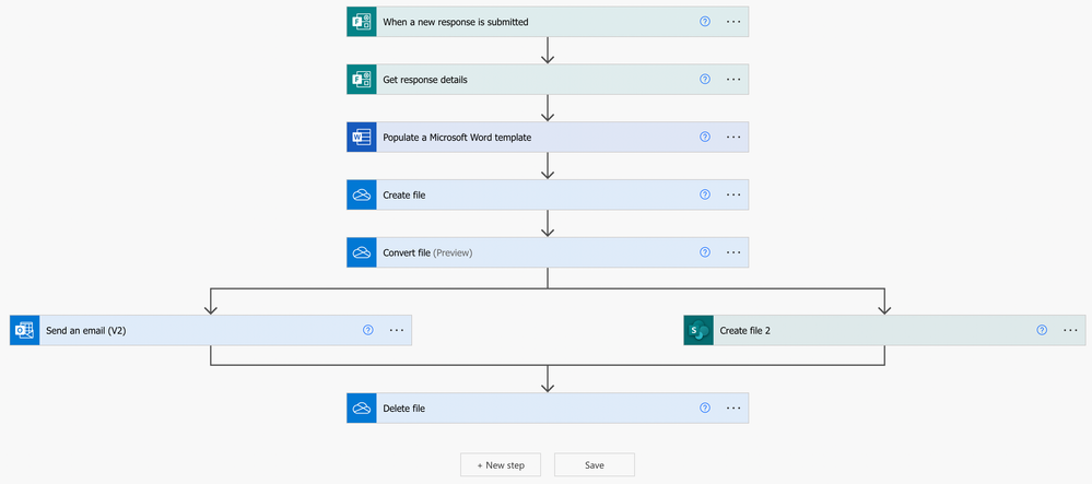 Your flow doesn't have to look like this exactly. For this flow, I'm keeping time-stamped copies of the pdfs as a backup but deleting the word documents.
