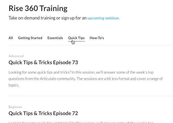 I am interested in subscribing, if possible, to the Quick Tips & Tricks episodes so I know when new ones are published. Are these episodes live webinars that we can attend, or are they pre-recorded and posted? Even though I found them from the Rise 360 Training page (see attachment), it appears these episodes touch on other Articulate apps as well. That's fine, since the team I'm on uses many of the apps. Is there a way to see a complete, comprehensive list of the episodes? The way they appear to me is in a random order.