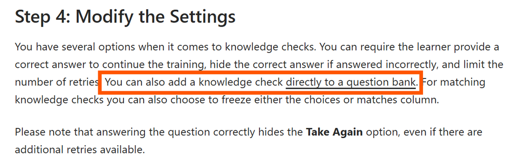 Hi, The post your are responding to is 4 years old. It has been possible to add a Knowledge Check question to a Question Bank for quite some time now, as stated in the Rise user Guide.