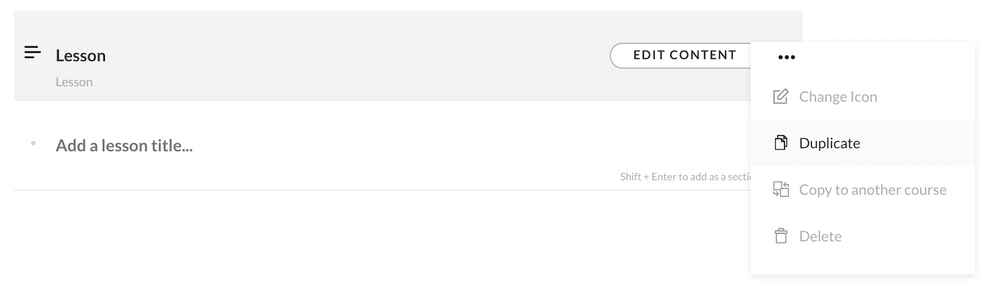 - On the course main menu page, hover over the lesson. Click the three dots icon, and select Duplicate. Now you have two identical copies of the same lesson.