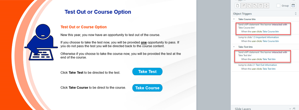 My team is having a blast learning how to use Storyline and all its features. We were successfully able to create courses that provide our learners with a "test out" option.