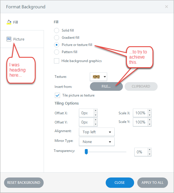 I have the same problem. I am able to fill the background with a picture, however, I want an image over the background that I can size and move. I see the two options "Fill" and "Picture". The Fill option works fine, but the Picture option is grayed out. Does anyone have any ideas about why it is grayed out?