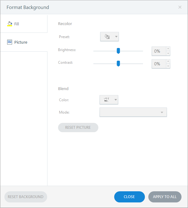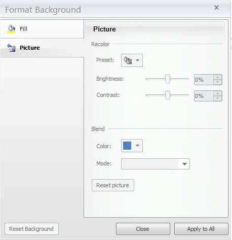When I try to format the background of my quiz slide master, the option to Reset picture is greyed out.  Does anyone know how to fix this?