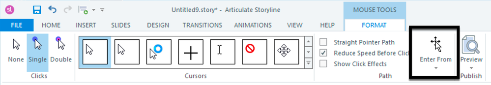 I noticed the same problem as Racquel Garcia. The "Enter From" option was disabled when I was trying to edit the cursor. I believe this has something to do with the fact that a Mouse Cursor cannot be copied. The "Enter From" option was only disabled in a slide that was duplicated from another slide. When I went back to the original slide, the "Enter From" option was enabled. It seems as though duplicating a slide with a Mouse Cursor on it will disable the "Enter From" option on the duplicated slide.