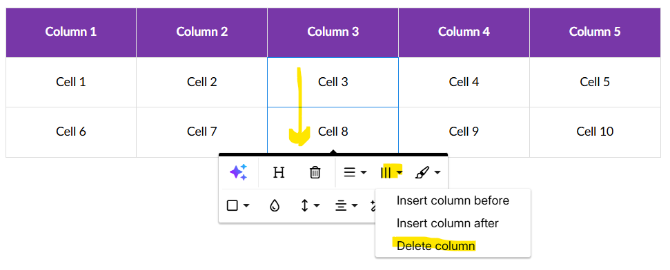 To delete a single Column, select two or more cells in the column that you want to delete. The table toolbar will appear. Click the Column icon. Select Delete column.