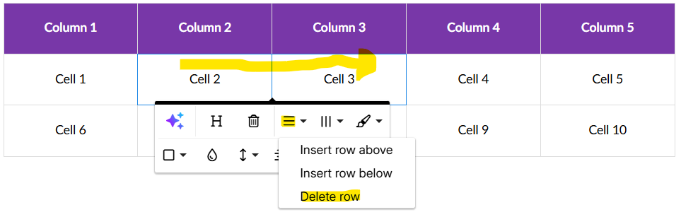 To delete a single Row, select two or more cells in the row that you want to delete. The table toolbar will appear. Click the Row icon. Select Delete row.
