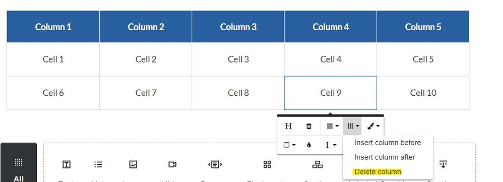 I am too facing the same issue. I need only 3 columns. Rise table by default has 5 columns. On the Table toolbar there is a delete icon button, but it deletes the entire table. I only seek a table with 3 columns. Please help me as to how can I delete the extra columns from the table. Thank you.