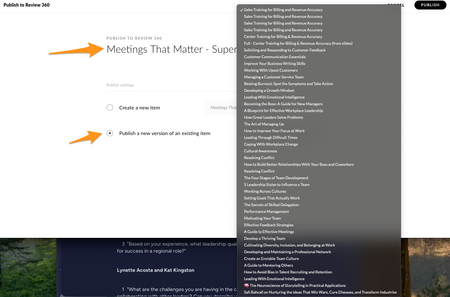 When publishing to review and choosing to publish a new version of an existing item, the dropdown option the list is huge, and I think it might be maxed out. Can that scroll be made so I can get to t...