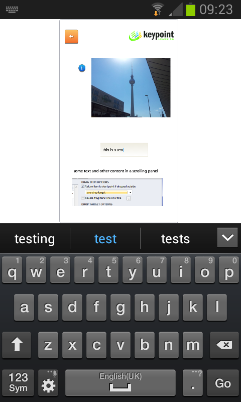 By the way, here is a screenshot of my test file with an image, marker, text entry box and scrolling panel and the keyboard being up when the text entry box is clicked. On my device, the content was scaled down to make room for the keyboard, I would have expected that the content remains unchanged and the keyboard overlaps the bottom part of the content.