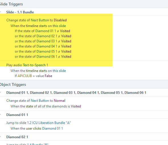 I am unable to proceed from Lesson 1 to Lesson 2. I have triggers set to not replay the audio, every time the learner returns to the "main" slide by using T/F variables. When I complete all of lesson 1, the "next" arrow populates but when it is clicked on, it does not progress to Lesson 2. Any help would be greatly appreciated.