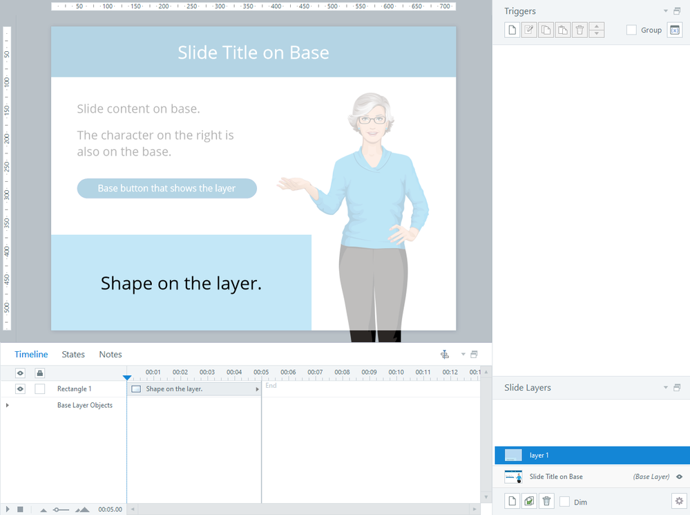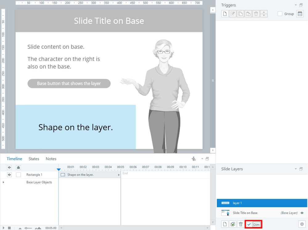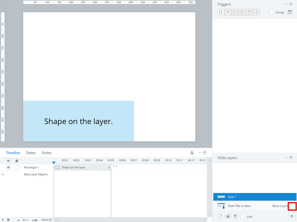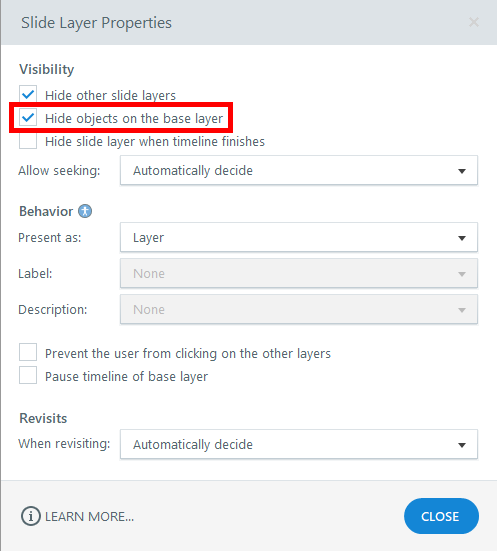The Slide Layer Properties let you hide all objects on the base when a user visits a layer in the published course. With this setting, the base will also be hidden when you're editing the layer.