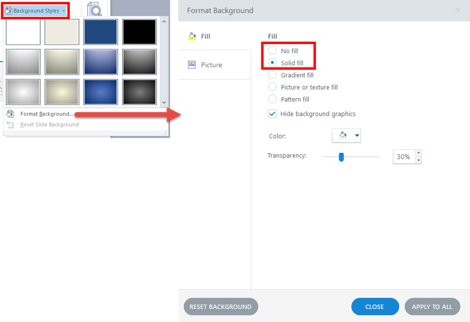 The background setting is accessed via DESIGN tab > Background Styles > Format Background.