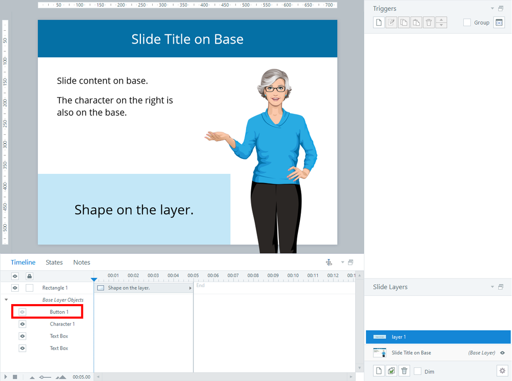 For example, the image below shows a deselected eye icon for Button 1 on the base. Thus, that button won't be visible when viewing the layer during editing nor when the course is previewed /published.