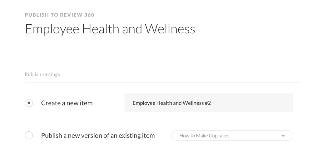 When you click the Review tab at the top of the Rise 360 course, you should see the page below. You'll have the option to Create a new item, or Publish a new version of an existing item.