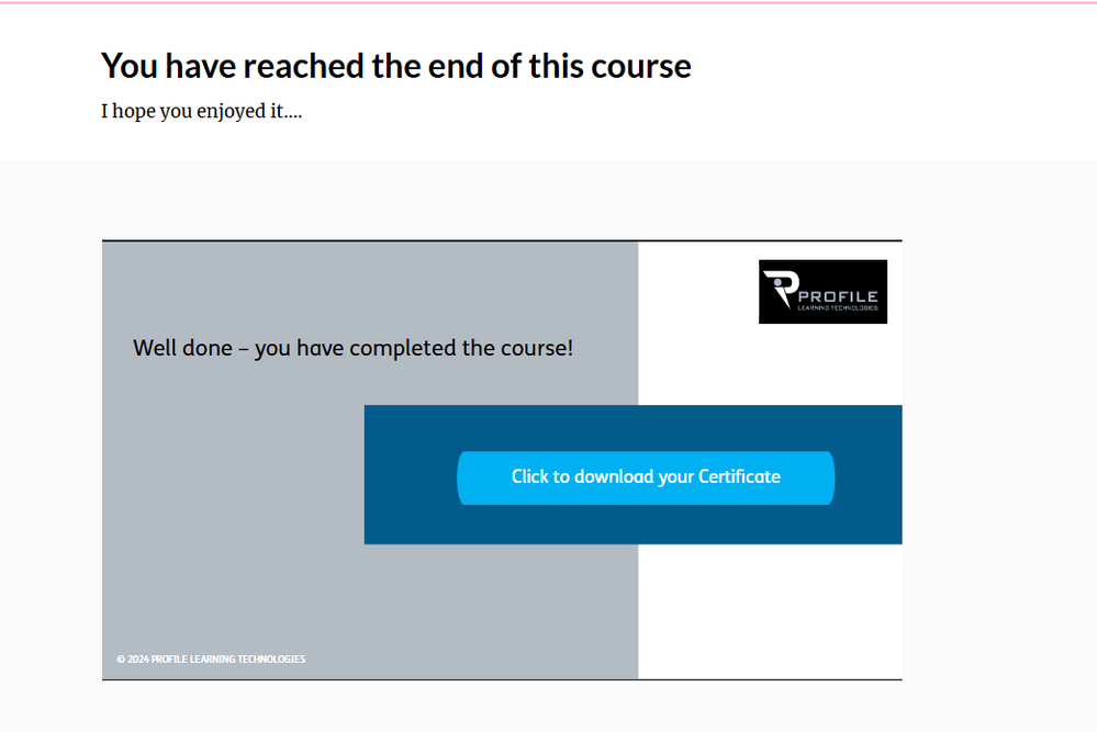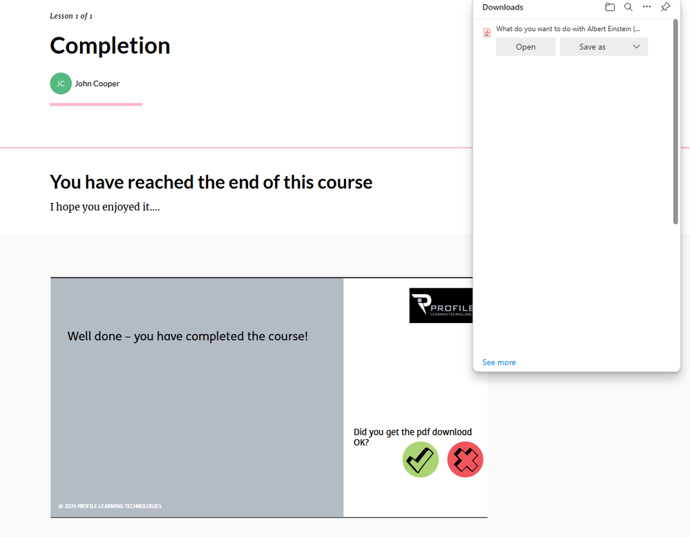 In the demo the learner keys in their name for the certificate but, obviously, if the name is available from an LMS then a simple JavaScript script can retrieve it. The Storyline block then has a "Click to download your certificate" button that executes the JavaScript that reads a pdf certificate template and fills in the Users Name and the date.