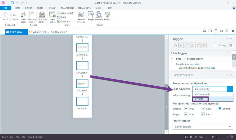 - Adjust the properties within the bottom right-hand corner window to advance slide By user.