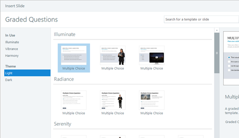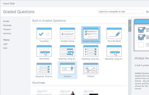 BUT, what you can do is Slides (tab) --> "Graded Question" AND make sure your template filters (down along the shaded left side) are all DEselected. Then the Built In Graded Questions (True/False, Multiple Choice, Multiple Response, Fill-in-the-blank, etc etc) will be at the very top !