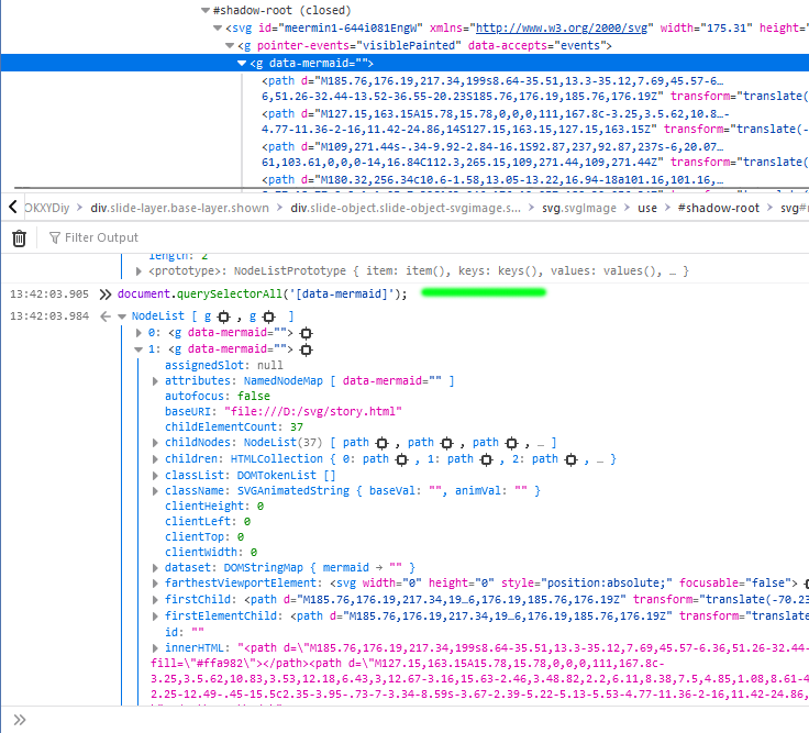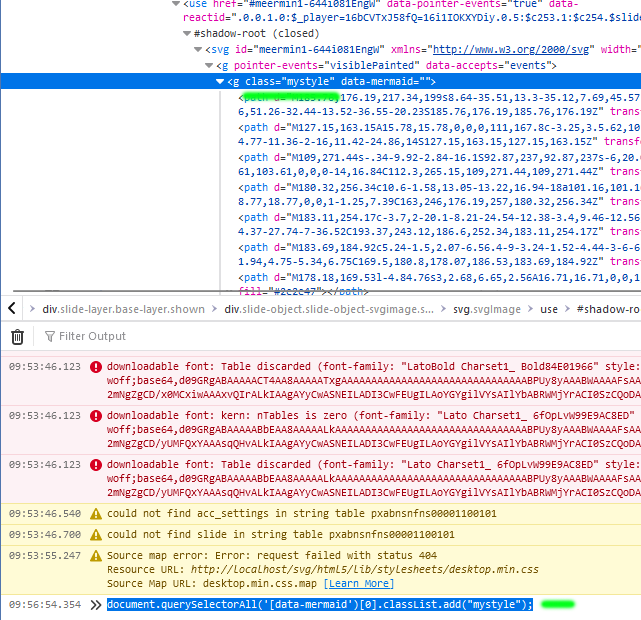 document.querySelectorAll('[data-mermaid')[0].classList.add("mystyle");I could modify the DOM tree - it seems possible to write into the 'closed' DOM
