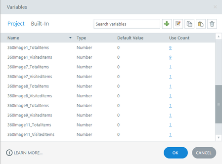 I have 7 slides with 360 photos on them. I want to use the variables assigned to each photo. 360Image1_TotalItems, 360Image7_TotalItems, 360Image8_TotalItems, ... 360Image1_VisitedItems, 360Image7...