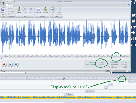 So, I'm doing a lot of audio sync. I'm listening to the wav in Media Player, and I want i.e. an arrow to appear at 3:48. Is there a way to set the main timeline to display minutes and seconds, not ...
