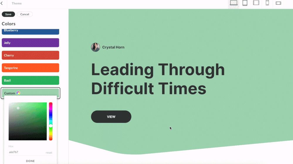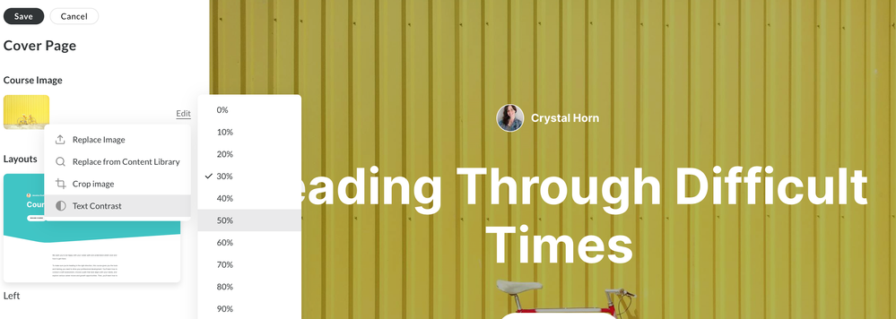 When you select a course cover layout that uses the theme color, the title text will adjust to white or black for the best contrast: