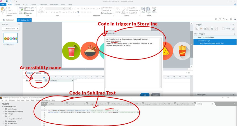 As you can see in the image below, coding inside Storyline is no fun due to missing colorcoding. I use Sublime Text for all my Javascript. The colorcoding helps great to see errors and ensure your code is fine. I also always name the layer of an element in Storyline to its 'Accessibility Name' That way its easier to quickly see how you named elements. If you did...