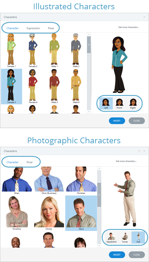 For the characters, you can still insert photographic characters into Storyline 3 and you should see all the characters shown when you choose insert. You can crop them still as illustrated characters. They don't have the option to insert just the headshot or torso, although if you had that set up in Storyline 2, that should still transfer over!