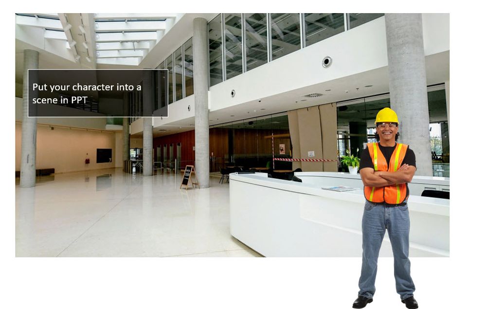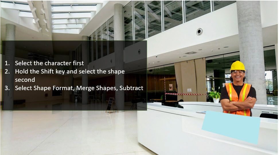 1) Make your slide background the image. Then add a shape over the top without rotating and use the format shape menu to fill the shape with the slide background. When you rotate the shape, strange things happen. You might get lucky and be able to create a "sandwich" with part of the desk over the top of your character. This didn't work well for me.