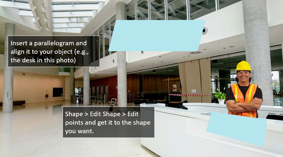 Another option is PowerPoint. PowerPoint offers some surprisingly powerful drawing tools. In a pinch, you can use PowerPoint. Since PowerPoint allows you to edit the points of shapes, you can import your image as a PowerPoint background then overlay your background with a slightly transparent rectangle. Edit the points of the rectangle so that your desk back edge is covered. Something sort of like this: