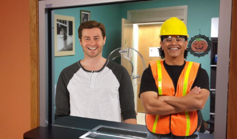 Here's what I would do. If you have Photoshop, bring the background image in and carefully mask / cut out the desk portion and save this as a PNG with alpha to lay over the top of your character. If you don't have Photoshop, the free GIMP will also do the trick. Open a copy of your background image in Photoshop or GIMP. Then create two new layers. These will be transparent. Cut your background image and paste into the top most layer. Delete or hide the white layer that's left behind.