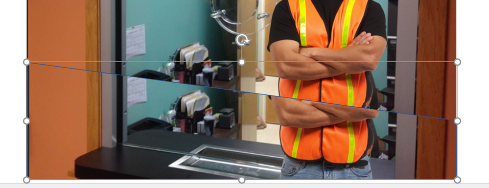 1) Make your slide background the image. Then add a shape over the top without rotating and use the format shape menu to fill the shape with the slide background. When you rotate the shape, strange things happen. You might get lucky and be able to create a "sandwich" with part of the desk over the top of your character. This didn't work well for me.
