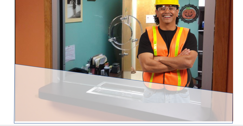 Another option is PowerPoint. PowerPoint offers some surprisingly powerful drawing tools. In a pinch, you can use PowerPoint. Since PowerPoint allows you to edit the points of shapes, you can import your image as a PowerPoint background then overlay your background with a slightly transparent rectangle. Edit the points of the rectangle so that your desk back edge is covered. Something sort of like this: