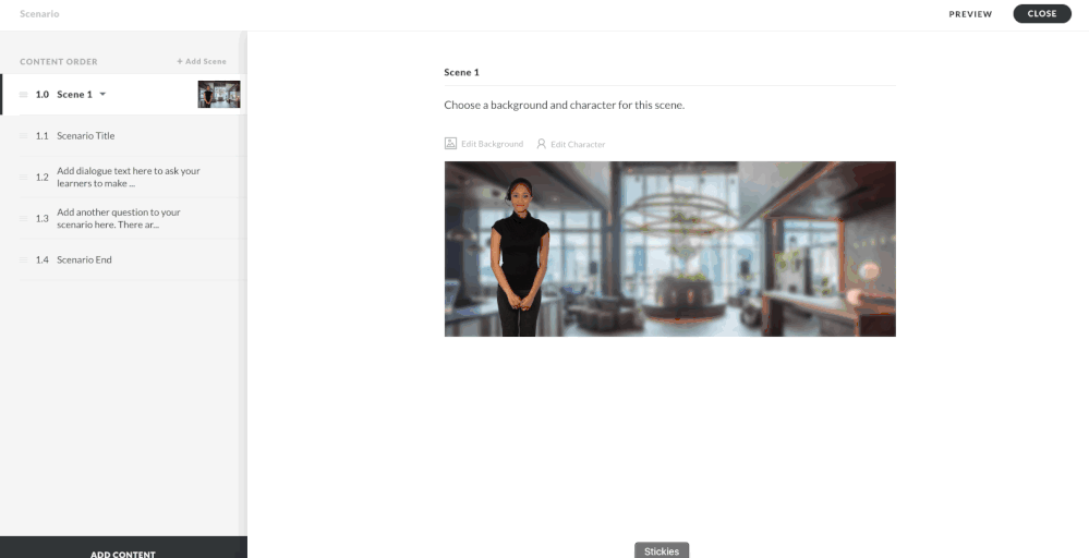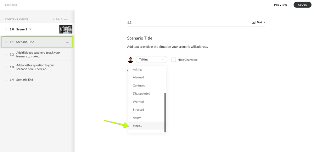 • Hi there, Tiffany! At the Scene level, you can choose the character and the background. Once you click one of the pieces of content within the scene (1.1, 1.2, etc), you can change the character's pose: