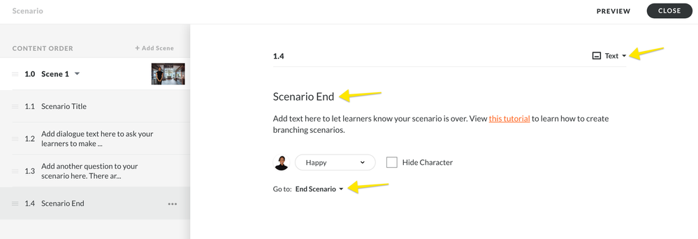 Insert a new slide at the end of your scenario and title it, "Scenario End." Choose the text option, and set it to go to End Scenario as shown below.