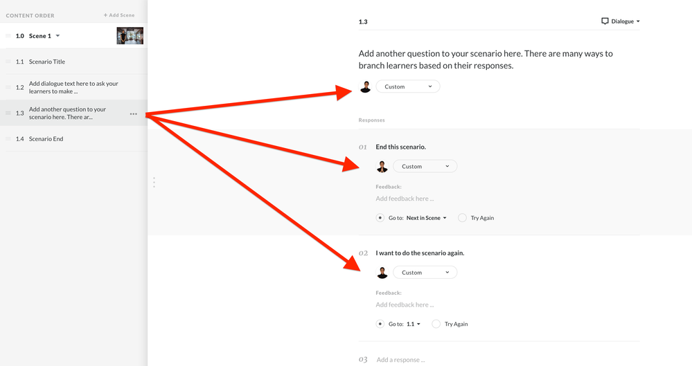 For instance, in the below screenshot, I had to change the character pose in each of the responses in this scenario content: