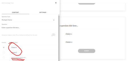 Hi there, Micah! Multiple choice and multiple response question types require at least 2 choices, which is why placeholders for 2 choices are provided every time you add either of these question types. This is also why you cannot delete any more choices if you only have two choices left in your quiz or knowledge check question.