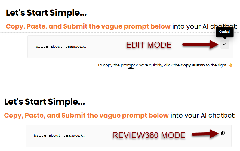 Today I noticed that in Review360 it seems the Code Snippet copy button does not allow the user to quickly click and copy the text. However, when the same copy button is clicked in the Edit view of my course, it works flawlessly.